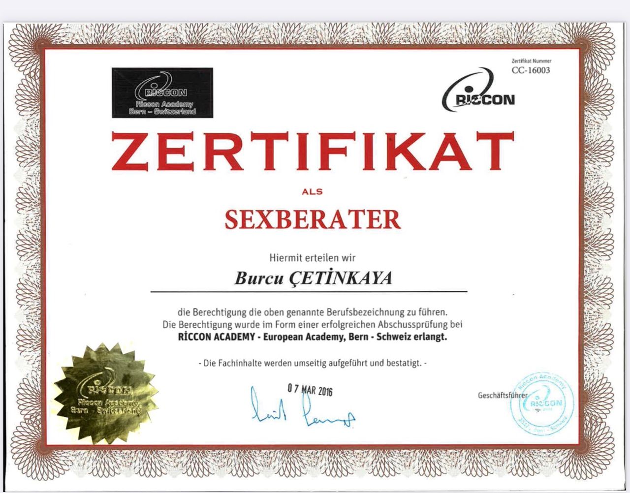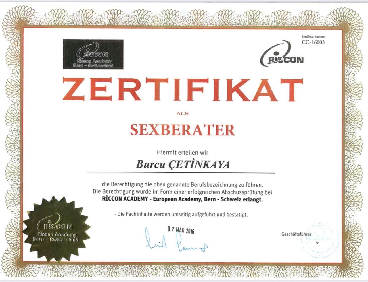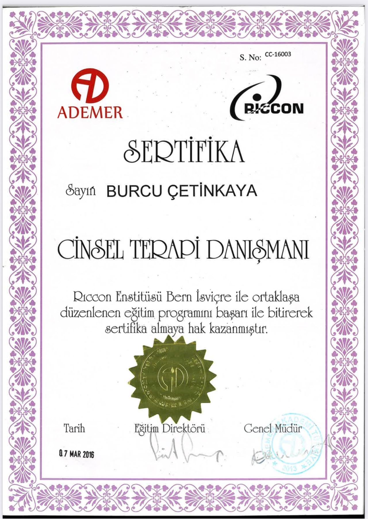 2009 yılında Ege Üniversitesi’nde Endo-Laparoskopik Cerrahi Eğitimi aldı. 2016 yılında İsviçre Riccon Academy Psikoloji Eğitimi ve Cinsel Terapi Danışmanlığı konusunda sertifikasyonunu tamamladı. 2017 yılında Amerika Nortwest Ünivesitesinde Psikoloji Eğitimini tamamladı. Hipnoz ve Hipnoterapi üzerine çalışmalar yaptı. 2018 yılında Amerika’da Pasific Üniversitesi’nde Psikoterapi CEO Sertifikasyon ve Mesleki Eğitim Akreditasyonunu tamamladı. Dublin Üniversitesinde (IDU) Klinik Psikoloji Yüksek Lisans ve Doktorasını tamamladı . Freud Universitat ‘da hipnoterapi eğitimi aldı uluslararası sertifikasyonlu Hipnoterapist yetkisini aldı. Akademik eğitimlerine paralel olarak Uluslararası Bilimsel Hipnoz, Hipnoterapi, Regresyon Hipnoterapisi, Adli Psikoloji , Klinik Psikoloji bölümleri , Nörobilim , Cinsel Terapi Uygulama ve Eğitim Sistemleri , Estetik ve Kozmetik Jinekoloji üzerine eğitim , sertifikasyon ve çalışmalar yaptı. Başkent Üniversitesi İlişki ve Aile Danışmanlığı eğitimi sonrası Milli Eğitim Bakanlığı Onaylı Aile ve İlişki Danışmanı ünvanını aldı . Kişisel gelişime dair bir çok koçluk eğitimi , Nefes ve Mindfulness Eğitimi aldı ; TC Sağlık bakanlığı GETAT uygulama yetkisine sahiptir.